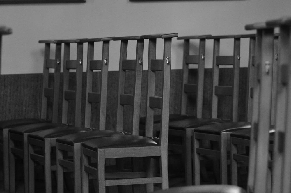 A whole row of authentic old church chairs neatly in a curved row. This picture is black and white.