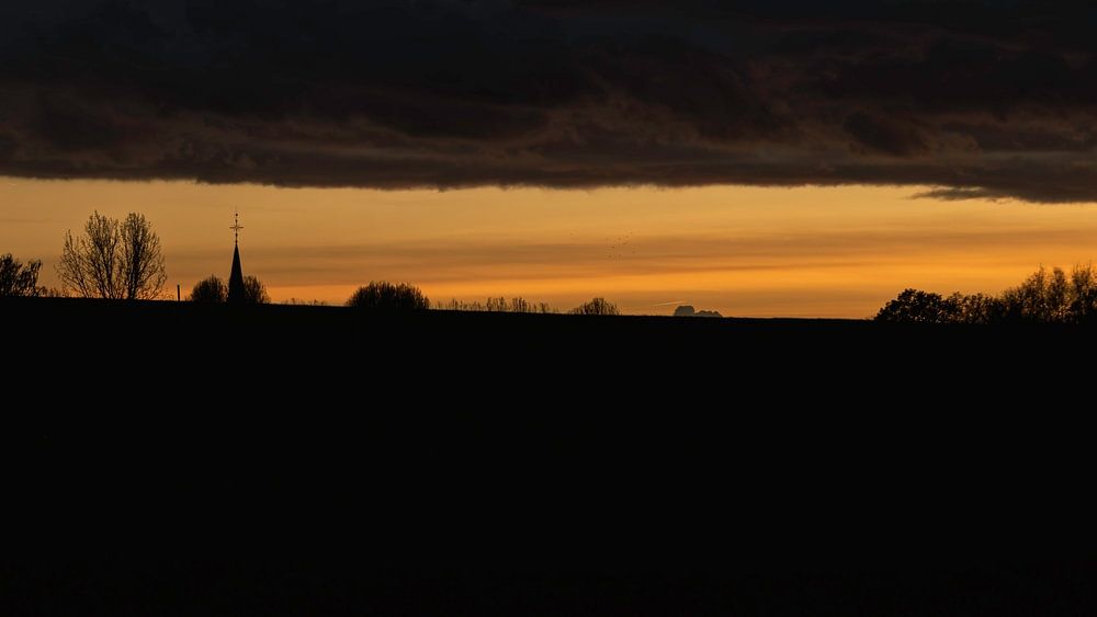 The most prominent feature is the church tower, which rises slender and pointed, also as a dark silhouette, just slightly left of centre. Above the horizon line, dark, heavy clouds dominate the upper half of the picture, adding a sense of drama and vastness. The overall atmosphere is peaceful but also a little mysterious, and the colour palette is limited to the warm glow of the horizon and the deep dark tones of the foreground and clouds.