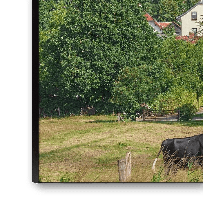 Buy this cow art Church with cows, pasture and cloud atmosphere by Torsten Krüger on canvas, ArtFrame, poster and wallpaper, printed on demand in high quality.