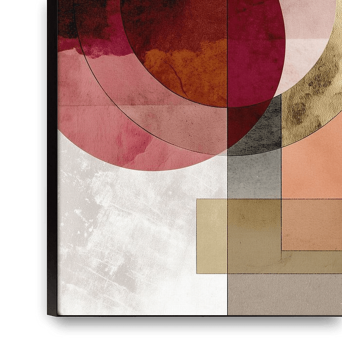 Circle Shapes | Golden Circle - This is an abstract painting with a large geometric circle motif divided into four quadrants and framed by a matte gold-coloured ring, combined with rectangular areas and watercolour-like spots in earth tones — an abstract painting, an abstract painting that mainly features ochre, rust, burgundy, pink and…