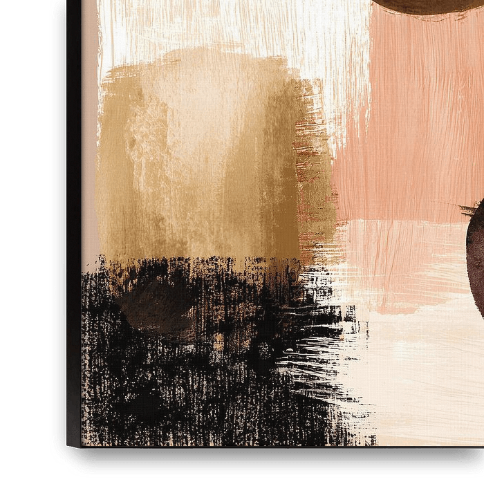 A playful yet balanced abstract work with round shapes in beige, brown, pink and gold tones. The combination of soft colours and clear shapes creates calm and coherence. Perfect for a warm living room or serene workplace.