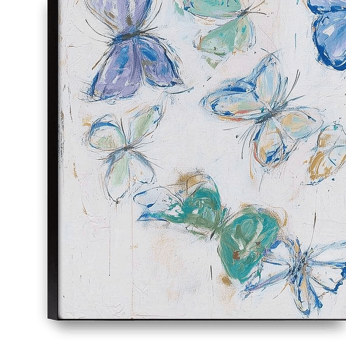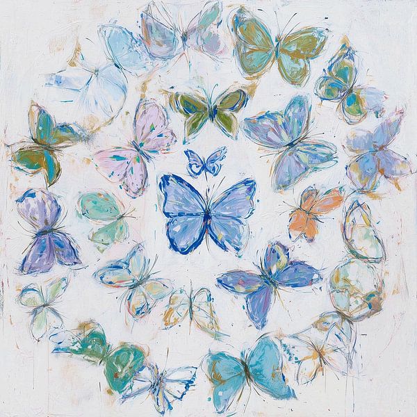 dance of butterflies in a soft palette of blue, turquoise, lilac, pastel green and hints of orange. The composition is circular: the butterflies seem to fly in a swirling motion around a central point, as if they form a colourful mandala together. Their shapes are playfully and loosely painted, with visible brushstrokes emphasising the…