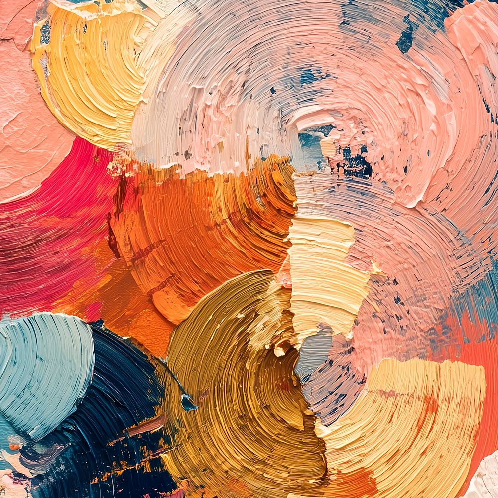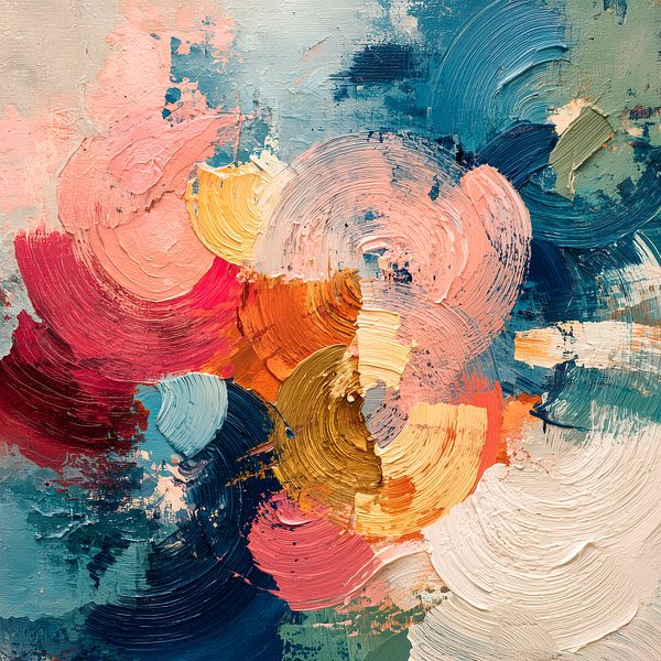An abstract composition filled with swirling, textured brushstrokes. In the foreground, circular figures in warm colours overlap and flow into cooler tones. The interplay of light and shadow within the layers creates depth. The brushstrokes are thick and expressive, creating a sense of movement, the overall composition is dynamic with a…