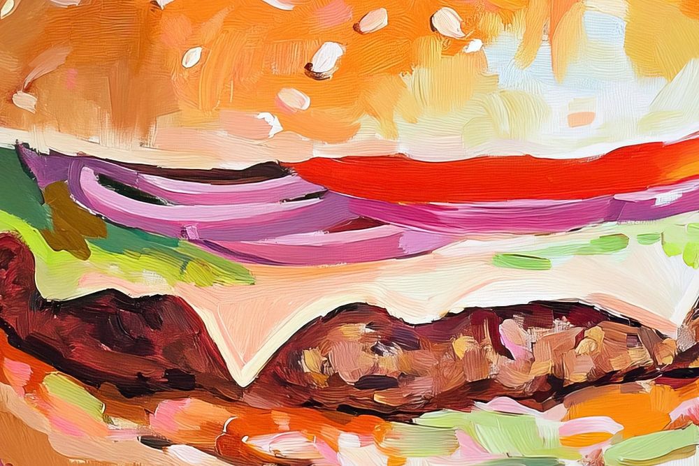 Details: food painting, burger art, expressive brushstrokes, pastel painting, colourful, food art, expressive, realism, culinary artwork, tasty image