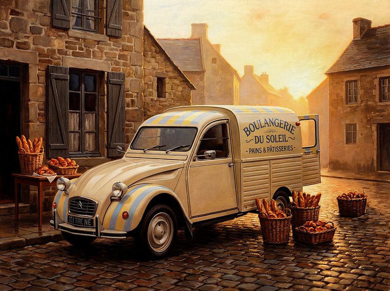 Step into a serene French village through this captivating painting, where a vintage Citroën 2CV Fourgonnette takes center stage. This iconic delivery van, with its cream and light blue hues, is parked on a cobblestone street, bathed in the golden light of sunrise or sunset. The Citroën 2CV Fourgonnette, adorned with "Boulangerie du…