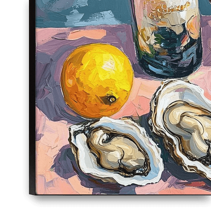 This vibrant composition is a colourful tribute to summer elegance, where oysters, lemons and red wine come together on a table bathed in Mediterranean charm. The artist uses a bold, pasty painting technique with thick, visible brushstrokes that add texture and energy to the image.