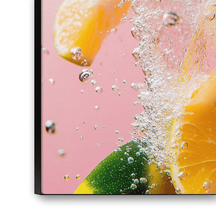 This beautiful picture shows juicy citrus fruits dipped in refreshing water, with vibrant colours contrasting against a soft pink background. The bubbling bubbles add a dynamic and playful element, giving the whole picture a fresh and energetic feel. Ideal for kitchen decoration or modern interiors, this image brings a touch of colour and vitality to any room. Perfect for lovers of fruity accents and cheerful colours, this artwork adds a sparkling atmosphere to your interior.
