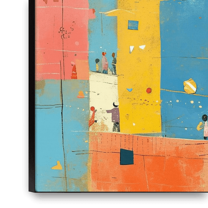 City Life Painting | Colorful Life Squares - This city life painting portrays a vibrant mosaic of human figures and architectural blocks in a dynamic, abstract style with a colourful palette of mostly blue and yellow.