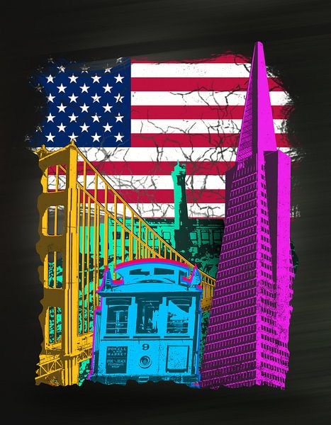 A vibrant pop art poster featuring iconic San Francisco landmarks set against the national flag. The striking neon colour palette and cracked, distressed background give the design a modern, energetic urban aesthetic. Perfect as a stylish wall decoration for the living room, office or bedroom, or as a special gift for travel and city…