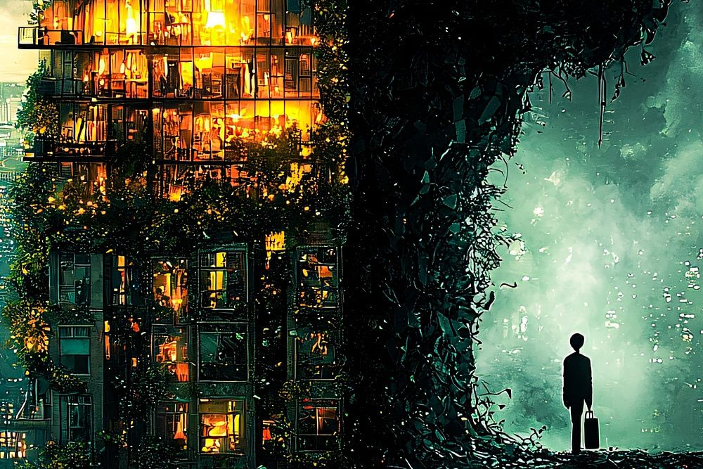 This unique design combines a vibrant city full of light and energy with the rustic beauty of nature. On the left side, the city radiates warmth and dynamism, while the right side shows a mysterious landscape with a silhouette that exudes balance and contemplation. The bright yellow and green hues contrast beautifully with the dark, serene surroundings, making this design a true eye-catcher in any interior. Perfect for lovers of art with a story.