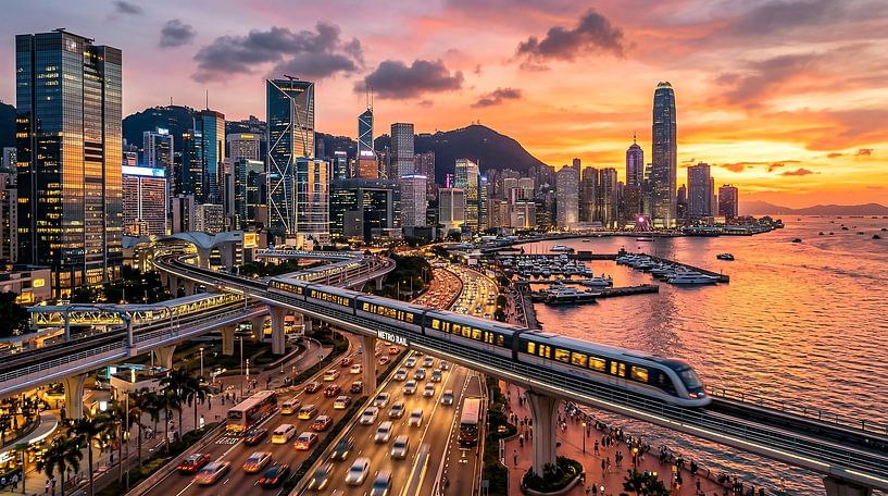 A vibrant coastal metropolis glowing at sunset with colorful skies and city lights. Perfect for wall art and urban decor.