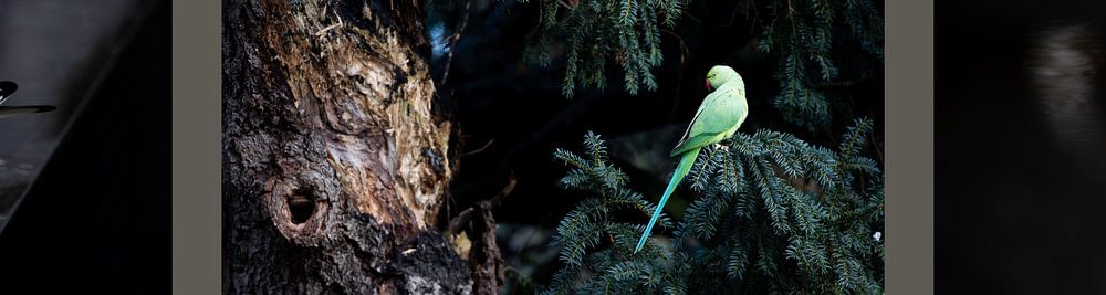 A collage of three typical city birds in Amsterdam, the Collared Parakeet, Black-headed Gull and Coot.