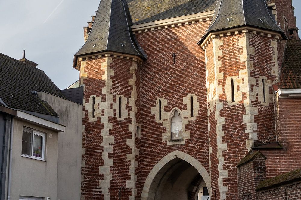 View of the 'Koepoort' in Ninove, East Flanders, Belgium, catching the early morning winter sun. The 15th century building is the only remaining city gate house in the town, and is a well known historic landmark in the Denderstreek.