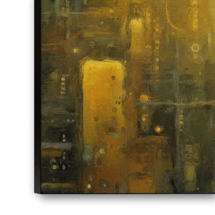 This work shows an abstract representation of a city illuminated by soft, warm glow. The buildings and structures are rendered in shades of green and yellow, with bright points of light lighting up like stars at night. The flowing lines and depte create a dreamy and atmospheric ambience, with the city seeming to float in a mystical world.