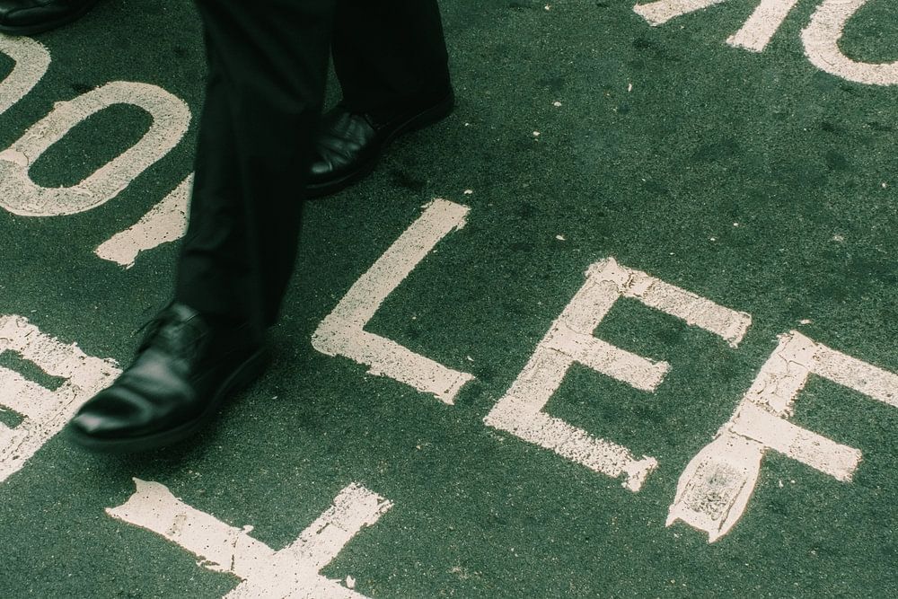 This urban cityscape perfectly captures everyday life on Hong Kong's streets. In the foreground, two people in suits and leather shoes walk across tarmac marked with eye-catching traffic signs and Chinese characters. The words "Look Left" and the Chinese characters symbolise Hong Kong's international culture and the dynamism of the metropolis. The image conveys speed, energy and a sense of movement in Asia's major financial centre. It appeals to lovers of modern street photography, dynamism and the urban art of living. The scene is ideal as a mural for workspaces, corridors or urban flats and encourages reflection on city life, culture and mobility. It symbolises the fusion of tradition and modernity that defines Hong Kong.