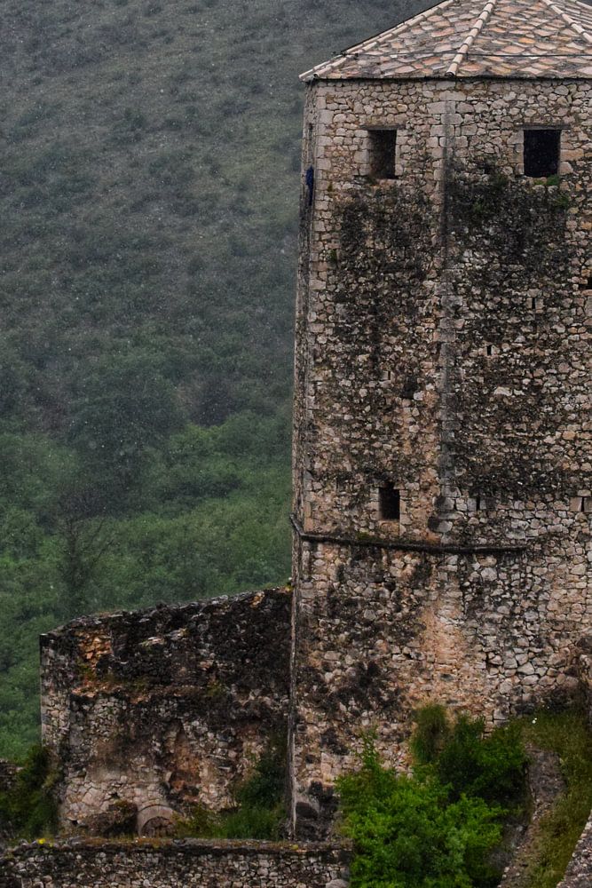 In the small historic village of Počitelj in Bosnia and Herzegovina, you will find many beautiful old buildings. Much of it was destroyed during the 1993 war. But this piece of town wall with tower still stands beautifully. A mystical photo due to the rain.