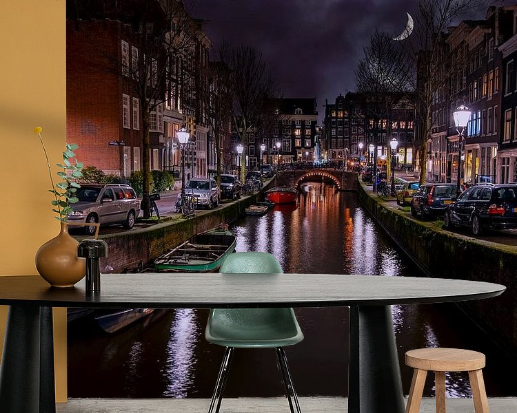 Cityscape of Amsterdam at night in the Netherlands