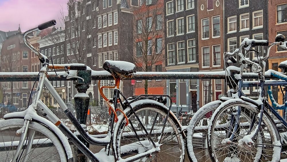About "Cityscape of snow-covered Amsterdm in winter in the Netherlands at sunset"