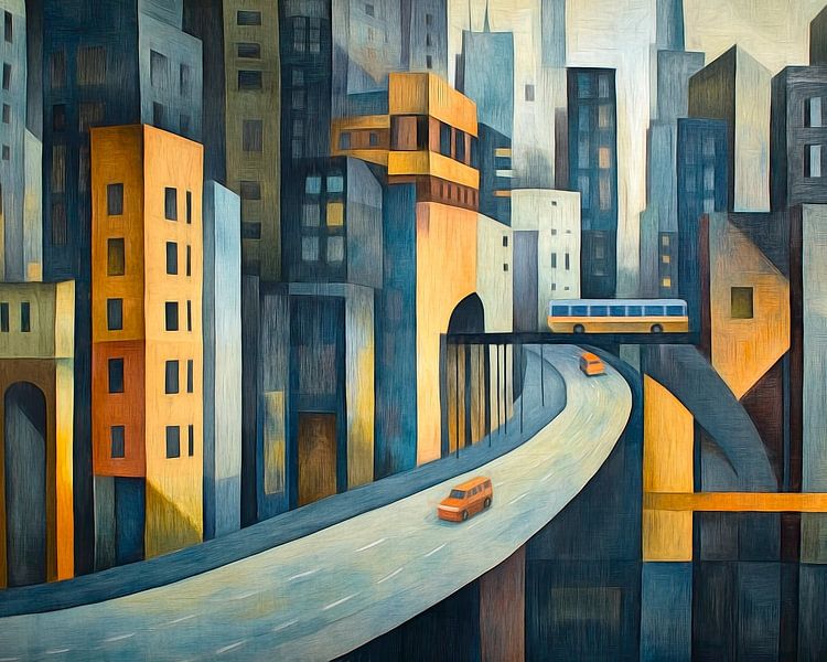 A winding road winds its way through modern skyscrapers in a futuristic city. Warm shades of orange and yellow contrast with cooler shades of blue.