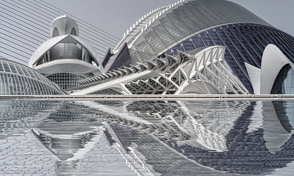 This is a photoshop composing of the fantastic futuristic buildings in the "Ciutat de les Arts i les Ciències" in Valencia. Most of them are built by the famous architect Santiago Calatrava.