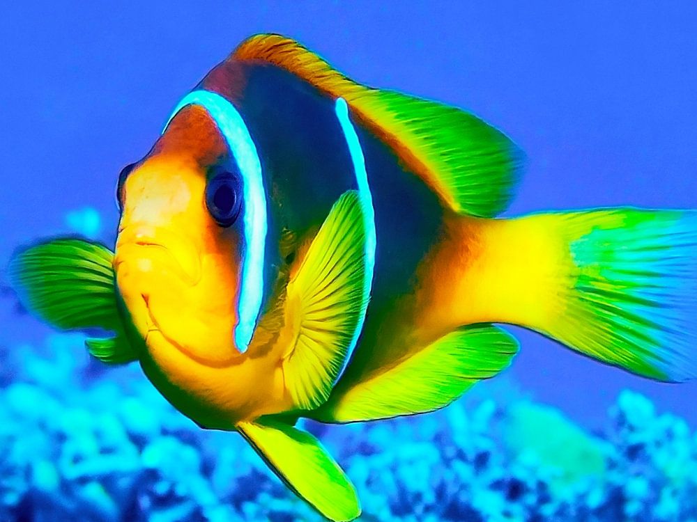 The basic colour of the Clark's anemonefish is black, parts of the head, fins and belly are yellow or orange.