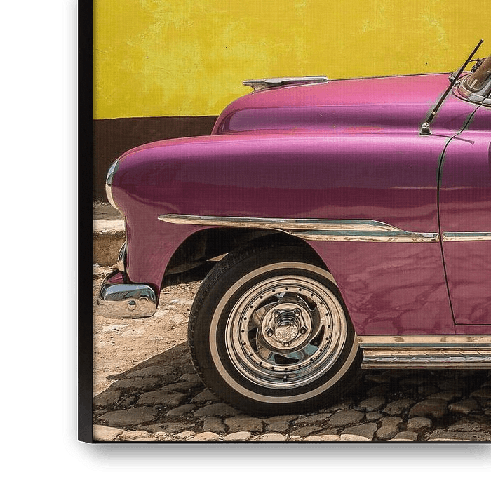 Purple classic American car. Photographed in the streets of Havana, Cuba. In Havana you find yourself in the 50s of the last century. The swarming with classic American cars like this. The image of this car is made attractive by the color combination of the color of the car against a wall in a complementary color. The photo was taken during a trip through Cuba where we several times in a car like this have been. They are used ideally as a taxi. For the photo was chosen to bring the car at eye-level screen. In this way, the vehicle in combination with the wall into its own right, without interfering elements of the environment.