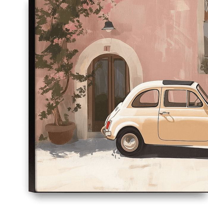 This artwork exudes the charm and simplicity of Italy. A classic Fiat 500 is parked in a sunny, Italian town, surrounded by soft pastel-coloured facades, white walls and Mediterranean details. Everything in this image feels light, warm and relaxed, as if time goes just a little slower here. The Fiat 500 is not just any car, but an icon…