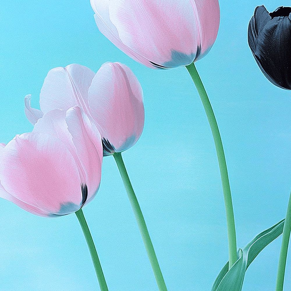 A bouquet of soft pink, white and a single black tulip gracefully reaches up against a calm sky blue background. This work captures the stillness of an early spring morning, when everything still seems possible.