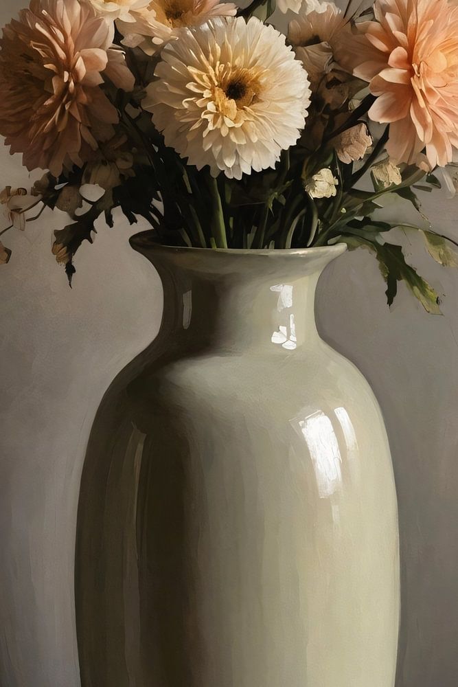The tranquillity and simplicity of this sculpture capture the imagination. A carefully arranged collection of flowers takes centre stage in a classic vase, whose soft colours make it a warm addition to any room. The flowers, in shades of white and beige, almost seem to dance in the still life, each contributing to the whole in its own unique way. The subtle use of colour and delicate shadows create a realistic effect, while the soft background highlights the subject. This design captures the timeless beauty of nature and brings it to interiors with a touch of classic charm. It is a perfect piece to bring a touch of elegance and tranquillity to busy living spaces or quiet study rooms. A testament to simple beauty, this still life is an ode to nature and an enhancement to the art collection.