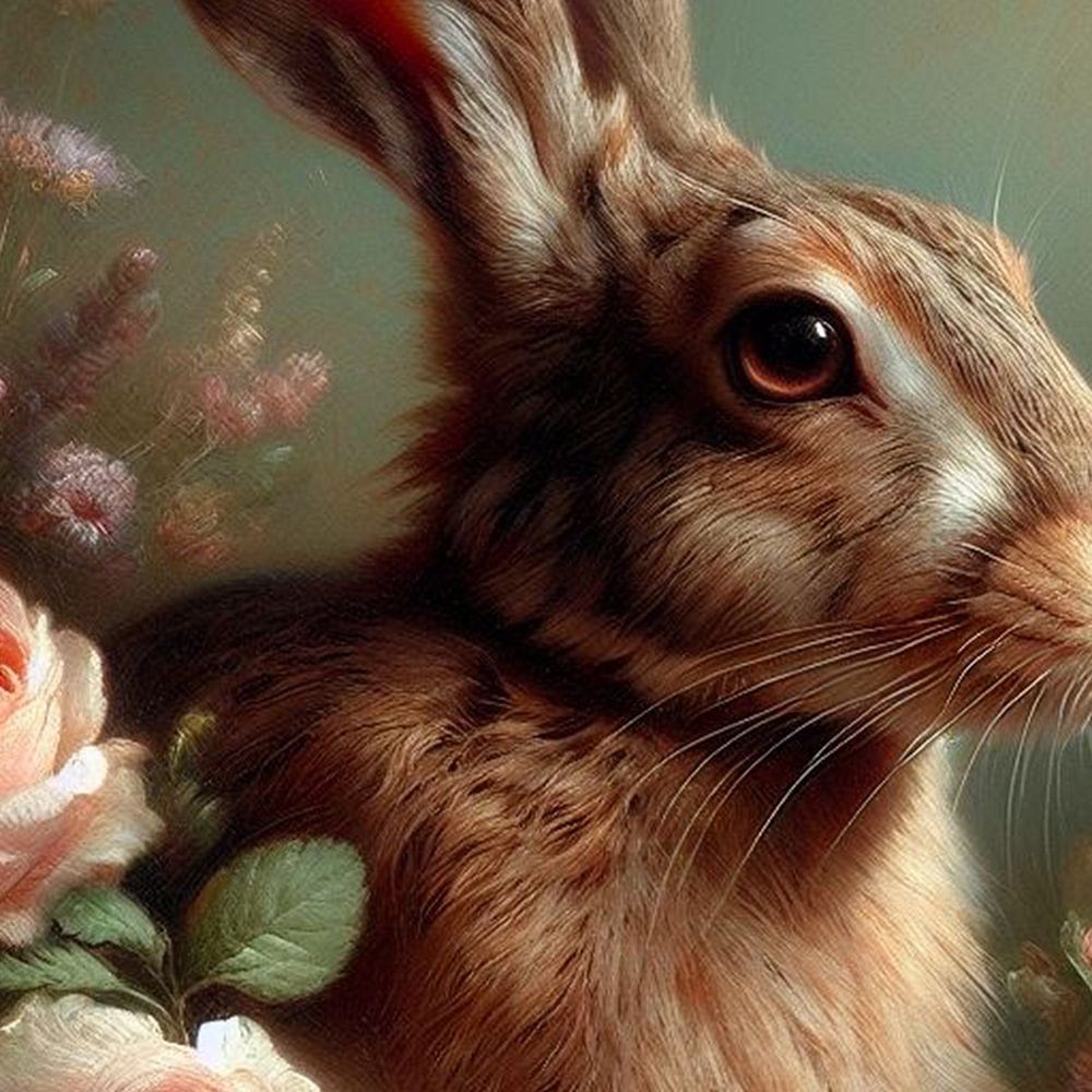 A digital artwork inspired by old paintings. A classic portrait of a rabbit surrounded by pink and white flowers against a green background.