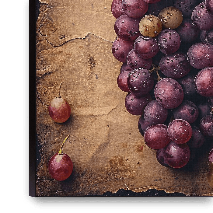 Immerse yourself in the timeless beauty of this masterpiece, inspired by Dutch painter Rembrandt van Rijn. A lush cluster of grapes, dripping with morning dew, is beautifully lit against a background of weathered parchment. The rich, deep hues of purple, green and brown evoke a sense of abundance and sophistication. This artwork is a…