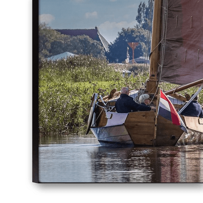 Classic wooden sailing ships sail through a ditch in the direction of the Sneekermeer.