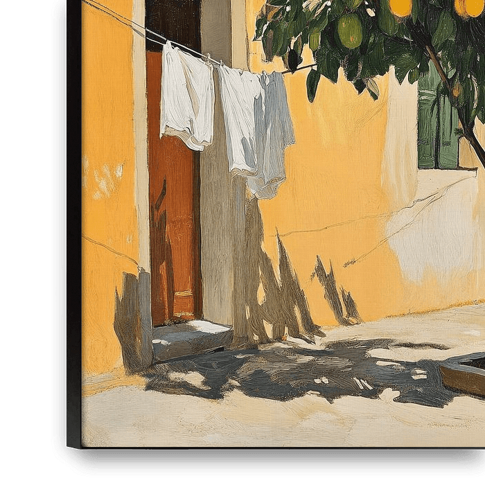 In this artwork, the clean laundry in a Mediterranean street is brought to life in a mix of warm colours and tones, which blend beautifully and evoke a summer atmosphere.