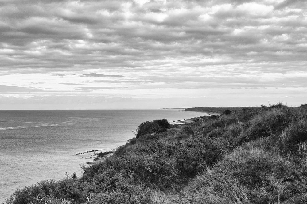 Hundested, Denmark on the cliff overlooking the Kattegat. Baltic Sea coast, grassy meadow, beach. Clouds on the horizon. Landscape photo from Scandinavia.