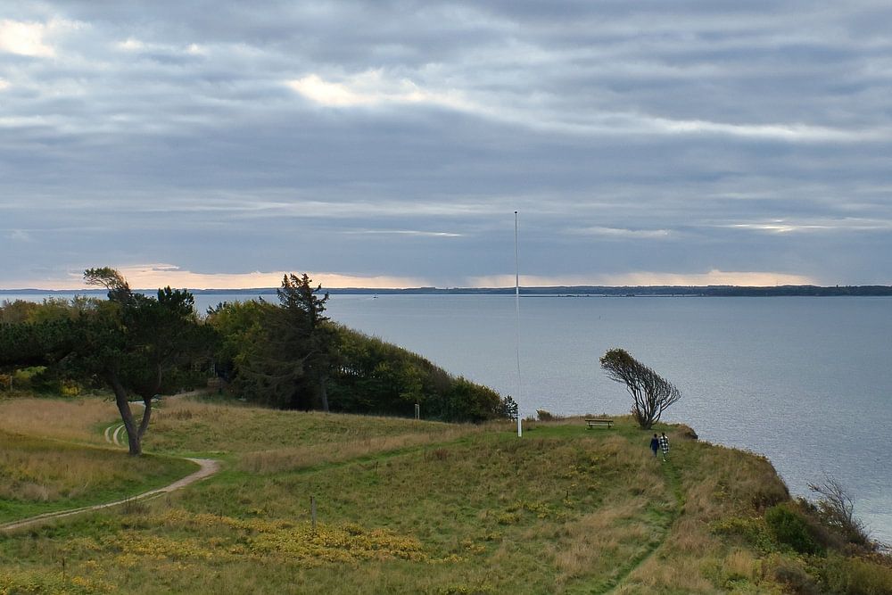 Hundested, Denmark on the cliff overlooking the Kattegat. Baltic Sea coast, grassy meadow, beach. Clouds on the horizon. Landscape photo from Scandinavia.
