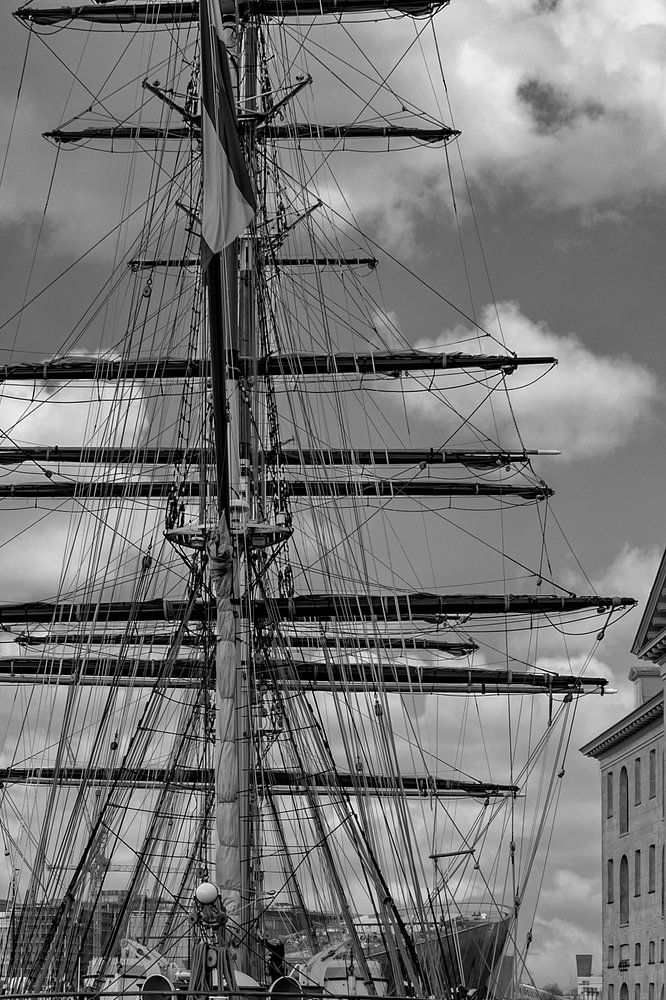A sturdy sculpture of a tough sailing ship moored in front of the Maritime Museum in Amsterdam. This work is executed in black and white which gives a nice accent to the overall picture.