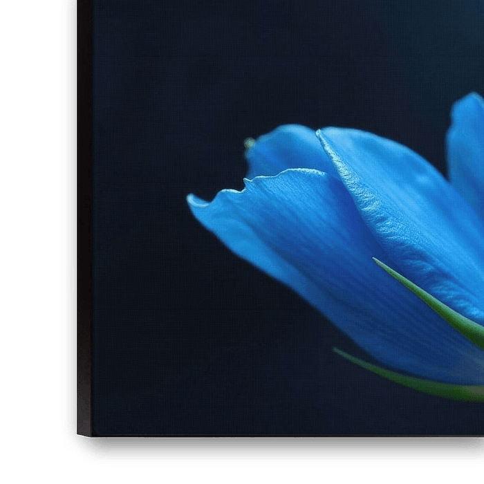 Close-up of vibrant blue flowers against a dark blue background. The main flower is in sharp focus, showcasing its petals, stamens, and pistil. Two smaller buds are visible.
