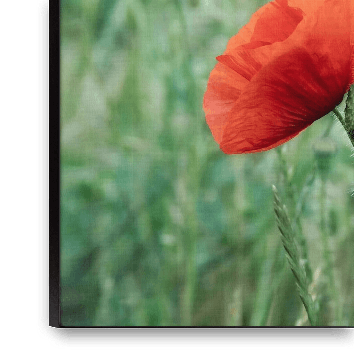 Wild Poppies in bloom in a square view. Bright red colors between the green. Bright summer photo that gives any room a cheerful and sunny appearance.