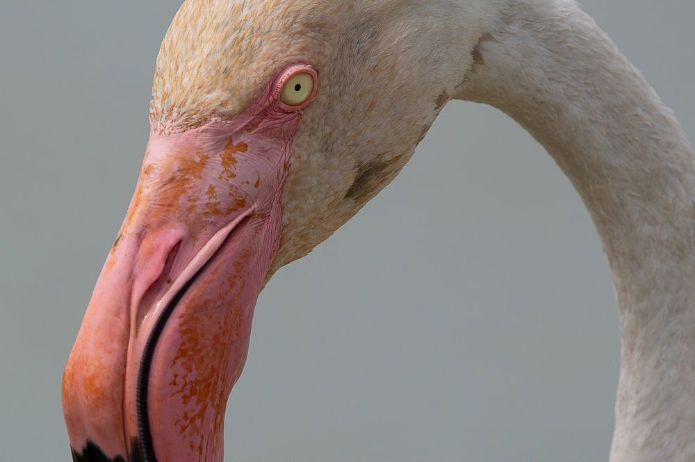 Close-up of the head of a pink flamingo, with a drop of water attached to its beak. Photo was taken at the Parc ornitologique de Gau in the Camargue in France.