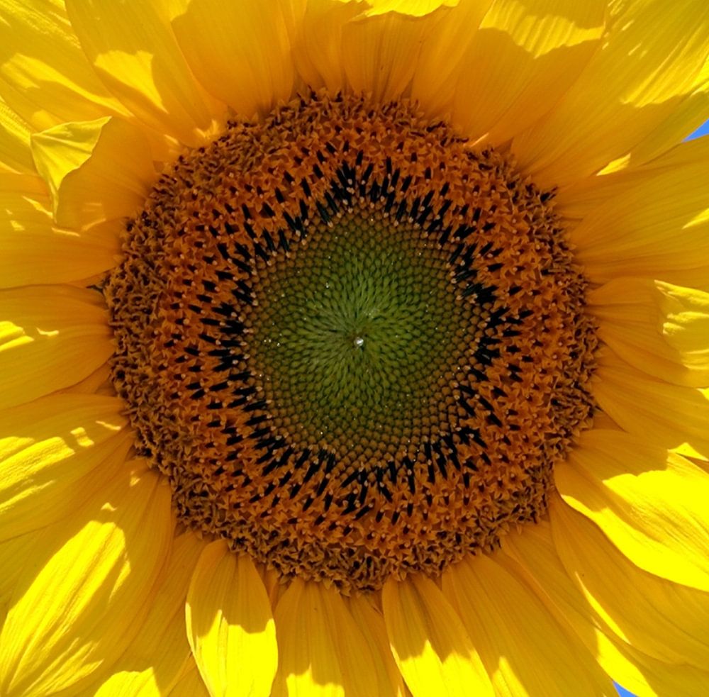 About "Close up of a flowering sunflower against a blue sky"