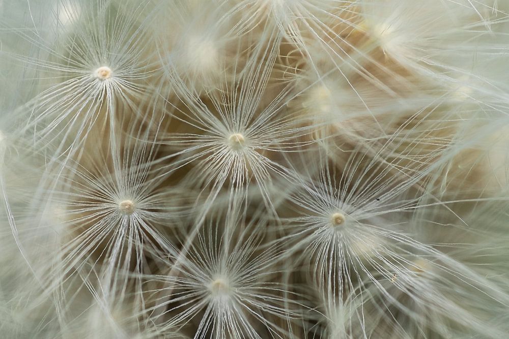 Close-up of the center of a dandelion fruit with light fluff waving in the wind. Narrow depth of field
