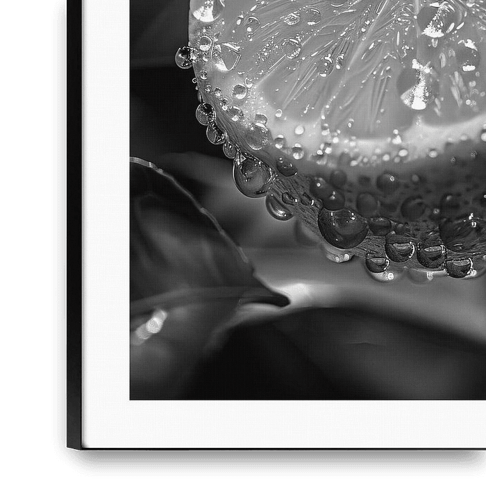 Detailed black and white photograph of a lemon with fresh drops of water, emphasising the texture.
