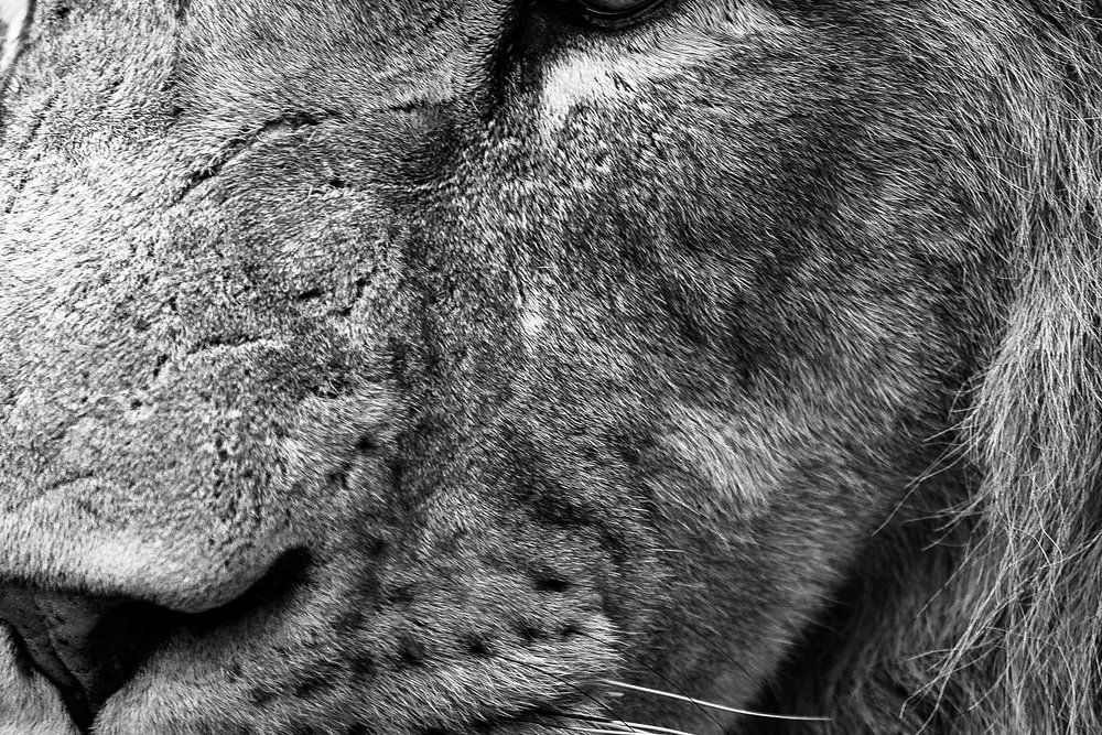 Buy this lion art Close-up of a lion in black and white by Suzanne Schoepe on canvas, ArtFrame, poster and wallpaper, printed on demand in high quality.