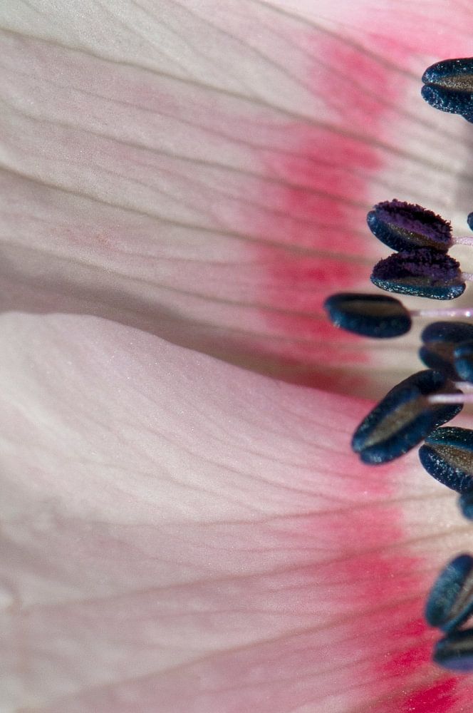 I love ranunculus, but even more so anemones. Tiny flowers with single leaves. They exist in red and blue. But my favourite are the delicate light-coloured anemones. White with some pink, yellow or light blue. Like this anemone with delicate pink-white bracts. The heart of the flower is another story. A solid bulb full of pistils and beautiful stamens around it. Not at all delicate or soft. Rather tough or firm. As here just visible in the dark blue on the right. The heart is a contrast to the bracts and it is this contrast that makes it such a beautiful flower.