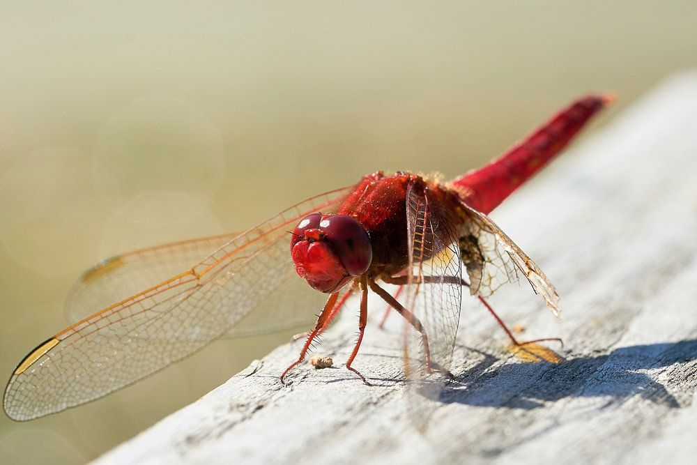 Red firefly, Crocothemis erythraea, at a jetty on a lake in Germany. The firefly is originally native to Africa and the Mediterranean region. Due to the mild climate, it has now also arrived in Europe.