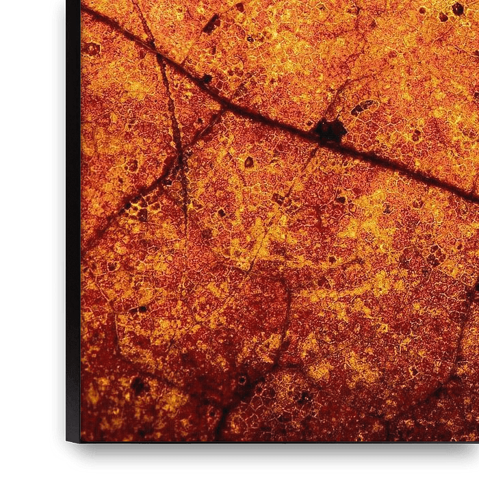 This work of art shows a single autumn leaf in impressive macro perspective, glowing in warm yellow, orange and red tones. The dark, net-like veins of the leaf form a fascinating graphic pattern that runs through the organic form and gives the composition depth and structure. The natural details are particularly remarkable: small…