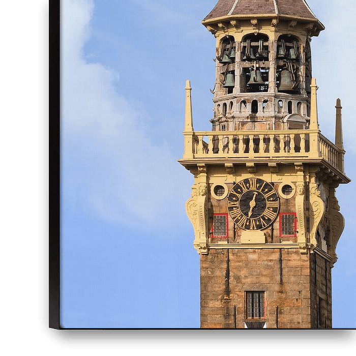 Buy the photo Close up of church tower with blue sky and clouds, Veere by Tony Vingerhoets on canvas, ArtFrame, poster and wallpaper, printed on demand in high quality.