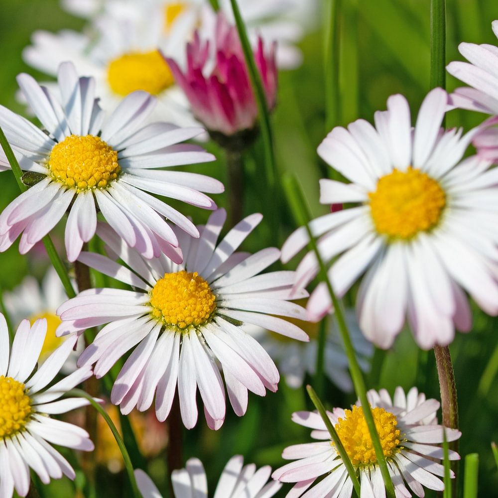 Daisy, Bellis perennis, in a close-up on a meadow.