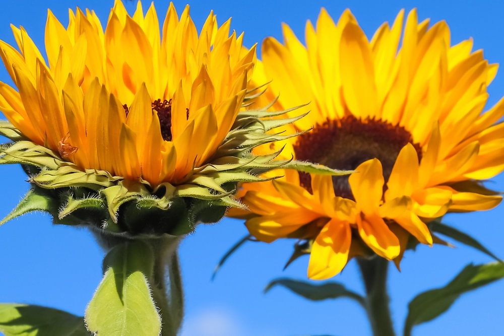 Buy this flower art Close up of two sunflowers against blue sky by MPfoto71 on canvas, ArtFrame, poster and wallpaper, printed on demand in high quality.