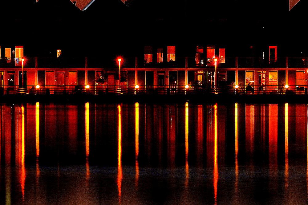 De gekleurde huizen aan de recreatieplas De Rietplas in Houten-Zuid met ervoor de fietsbrug. De lichten van de huizen en de fietsbrug weerspiegelen in het water van de plas.